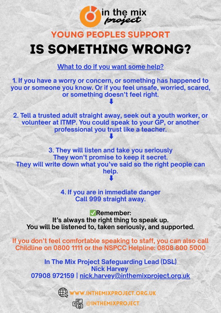 If you have a safeguarding concern or would like more information on our safeguarding processes, you can contact our DSL – Nick Harvey on 07908 972159 or nick.harvey@inthemixproject.org.uk.